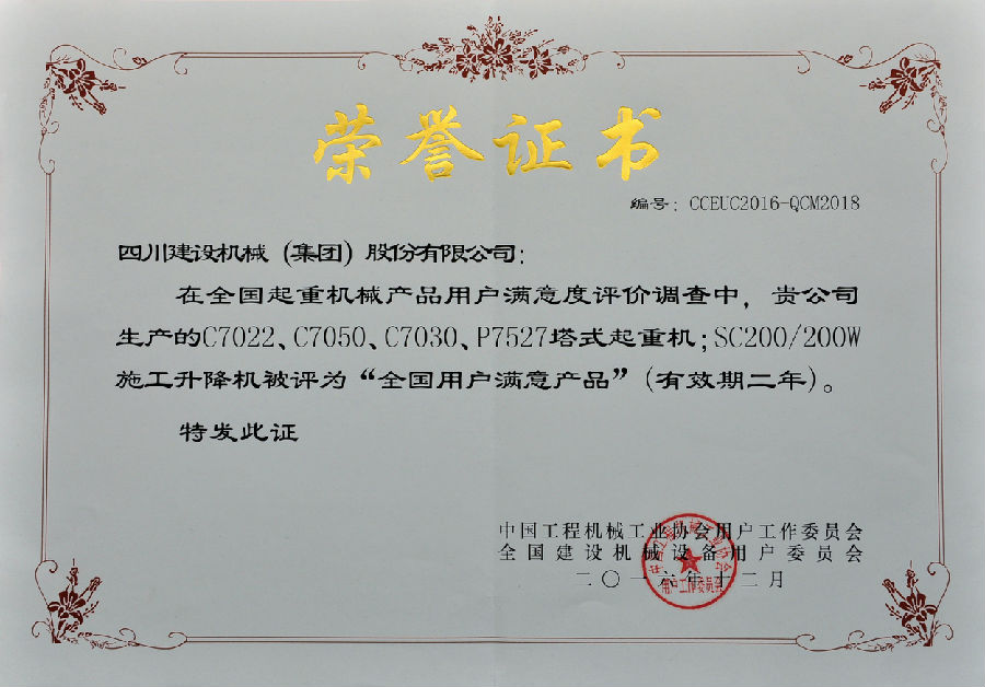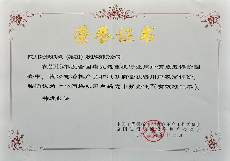 2016年全国用户满意产品评价测评结果公布,LEDONG.COM-乐动(中国) 凭借良好的产品和服务质量获得全国用户的较高评价,荣获了“全国塔机用户满意十强”企业;获得产品质量调查连续十一次评价“全国用户满意”企业;公司生产的C7022、C7050、C7030、P7527塔式起重机以及SC200/200W施工升降机被评为“全国用户满意产品”;同时获得“用户满意服务”奖;1989年至今LEDONG.COM-乐动(中国)已连续十一次获得全国用户满意奖,得到了业内用户的高度认可。